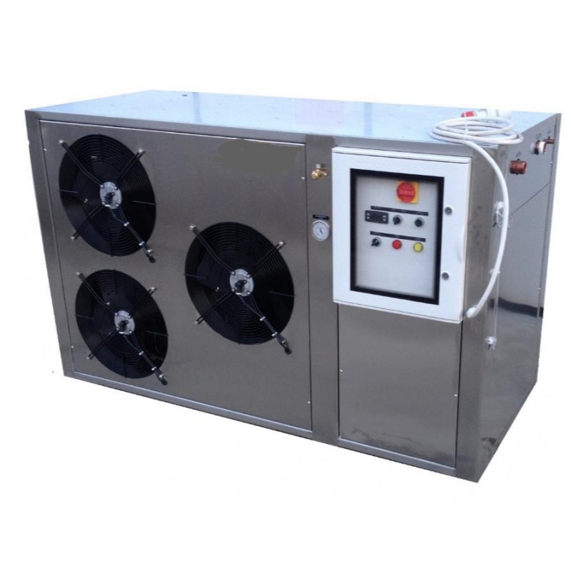 – Sistema hydronic instalado dentro del equipo de frio, con depósito de almacenamiento de circuito abierto en acero inox aislado térmicamente y kit de bombeo de agua gestionado por una o mas bombas eléctricas multitrail de acero inox aisi 304